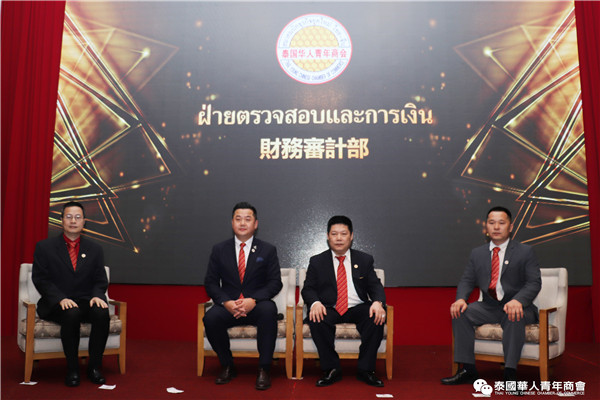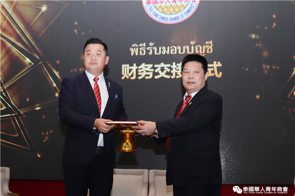 泰国华人青年商会李嘉淳会长致辞完毕,举行财务交接仪式,由副会长兼财务部召集人郑树丰接领,随后,郑树丰副会长作财务报告,会长助理连剑丰、郑桂涛审核财务,全体与会成员举手通过。