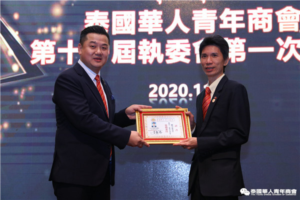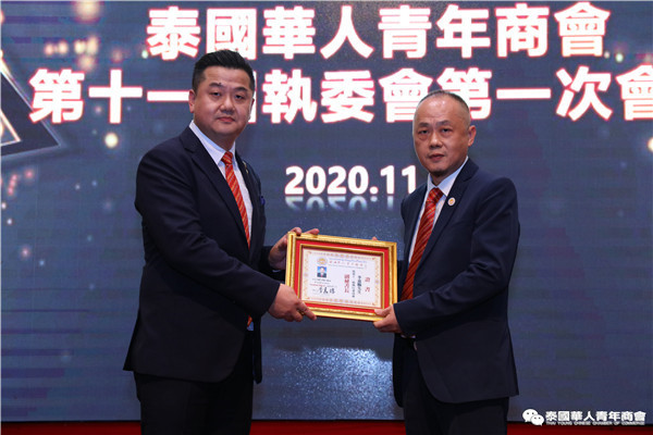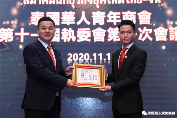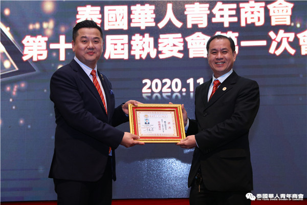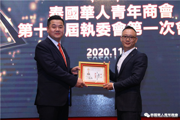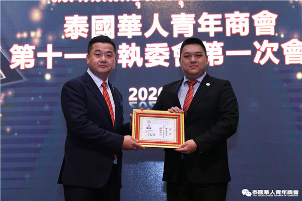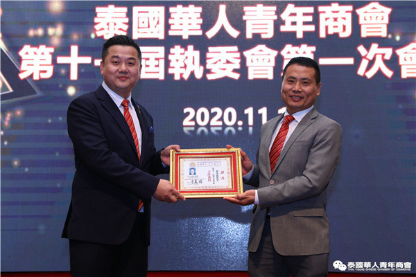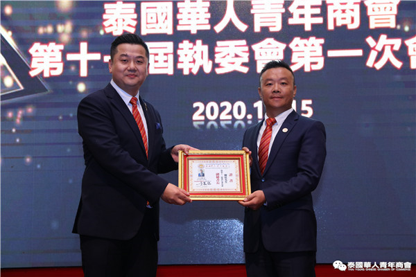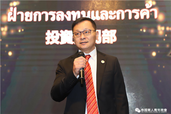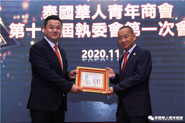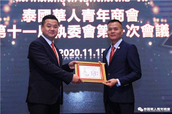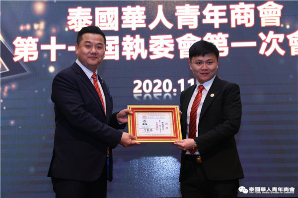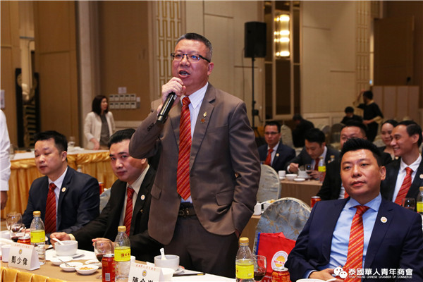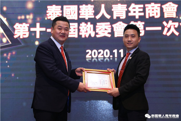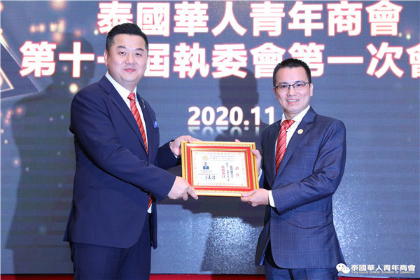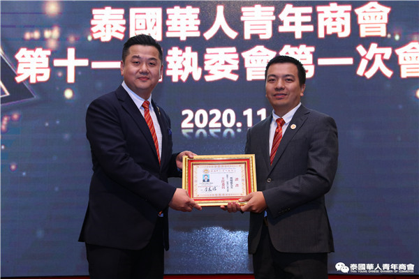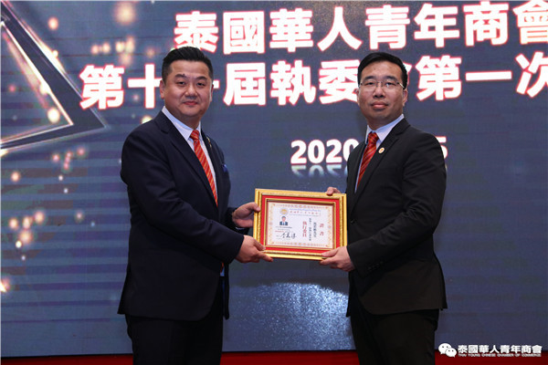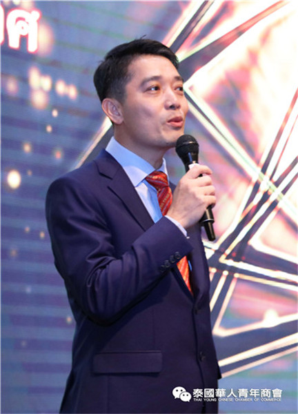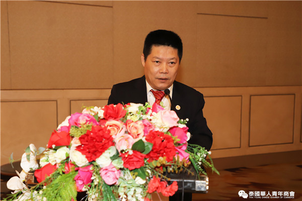 今年是泰中正式建交45周年,中泰全面战略合作伙伴关系不断得到新发展,中国已连续7年是泰国最大的贸易伙伴,2019年成为泰国最大外资来源国。目前在全球新冠肺炎疫情防控形势依然严峻的情况下,第三届中国国际进口博览会如期举行,再次证明中国疫情防控取得重大战略成果,表明了中国对外开放的决心和信心,充分体现了中国负责任的大国担当,为受到疫情冲击的泰国中小企业带来了希望,相信泰中双边经贸合作将继续深入,进一步推动“东部经济走廊”与“一带一路”倡议、粤港澳大湾区建设对接,期待深化全面合作,促进共同发展。请各位同仁做好准备,后疫情会给我们带来非常大的经济机遇。未来,需要我们去拼搏,去奋斗,去开拓;有更多的宏伟蓝图,需要我们去构想,去描绘,去践行;还有更多的梦想,需要我们去憧憬,去追逐,去实现,让我们携手并肩,共同续写泰国华人青年商会的新篇章,为泰中两国的繁荣昌盛做出新的、更大的贡献。谢谢大家!