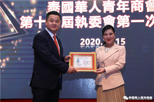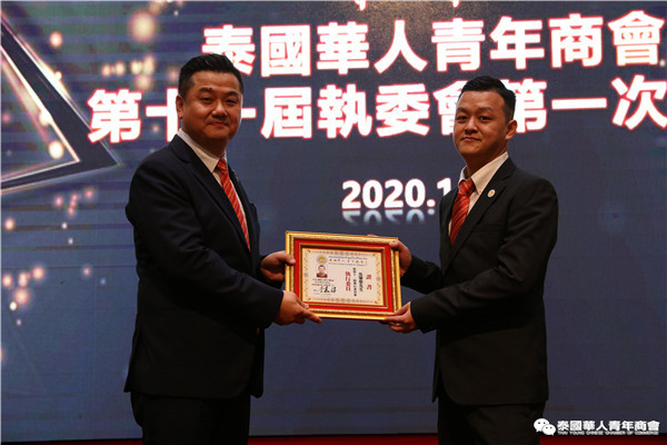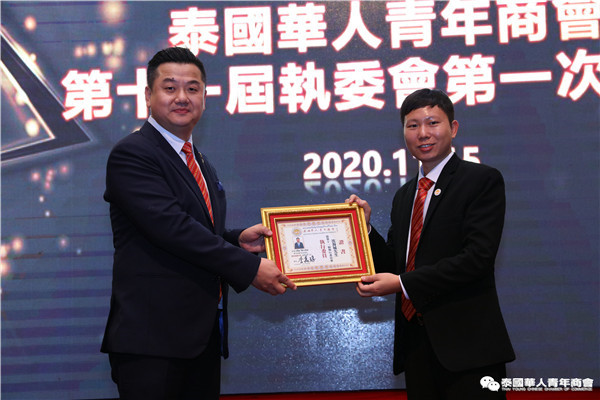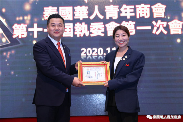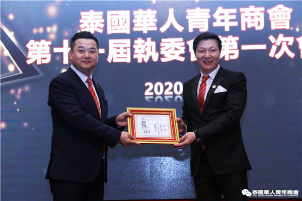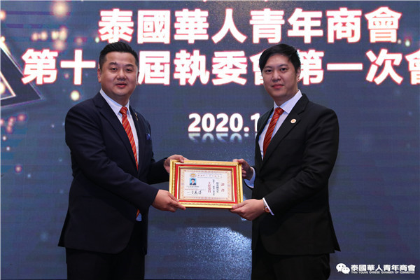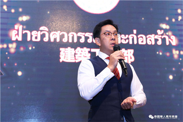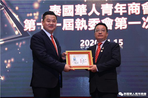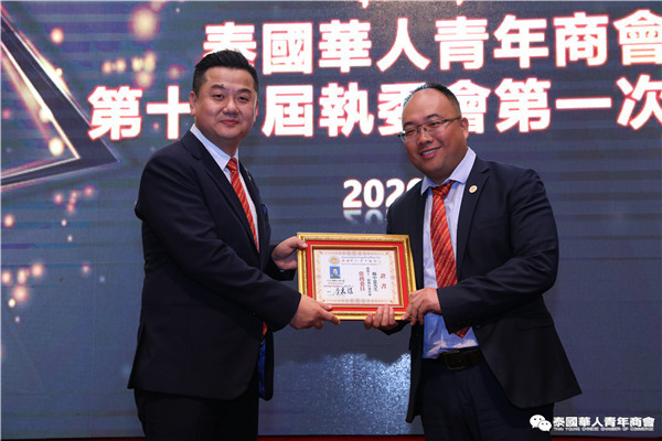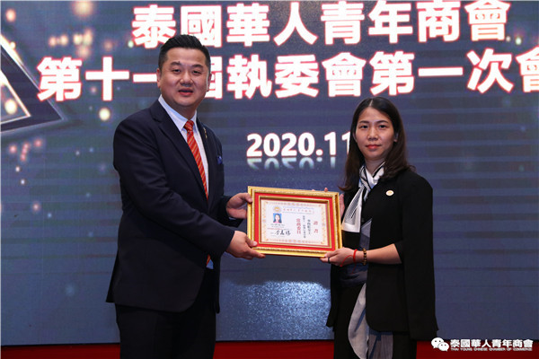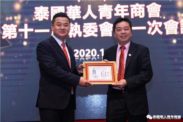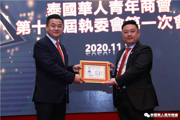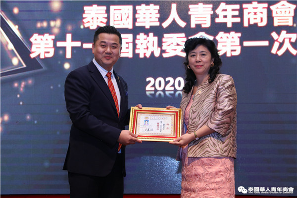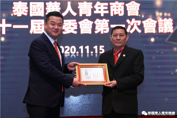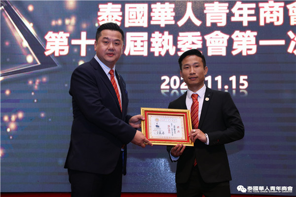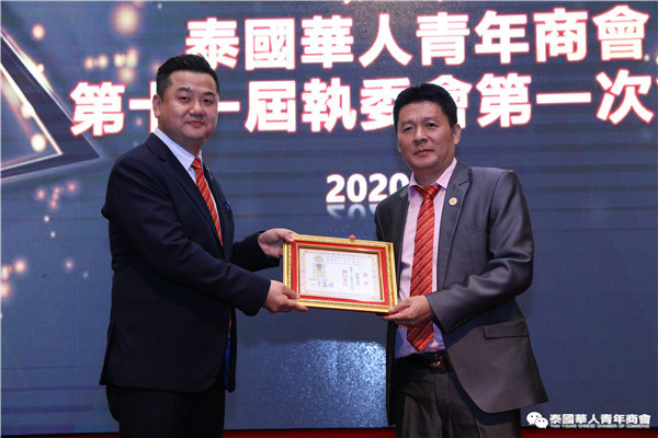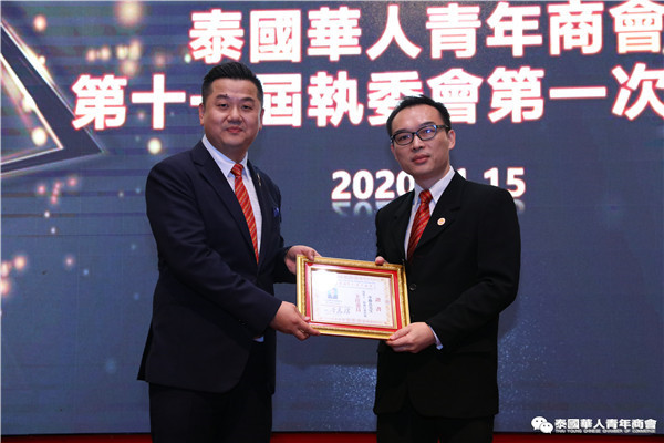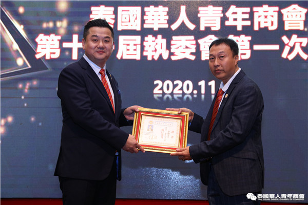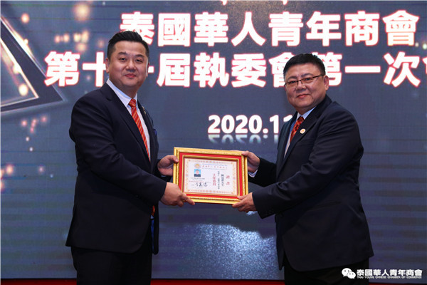 今年是泰中正式建交45周年,中泰全面战略合作伙伴关系不断得到新发展,中国已连续7年是泰国最大的贸易伙伴,2019年成为泰国最大外资来源国。目前在全球新冠肺炎疫情防控形势依然严峻的情况下,第三届中国国际进口博览会如期举行,再次证明中国疫情防控取得重大战略成果,表明了中国对外开放的决心和信心,充分体现了中国负责任的大国担当,为受到疫情冲击的泰国中小企业带来了希望,相信泰中双边经贸合作将继续深入,进一步推动“东部经济走廊”与“一带一路”倡议、粤港澳大湾区建设对接,期待深化全面合作,促进共同发展。请各位同仁做好准备,后疫情会给我们带来非常大的经济机遇。未来,需要我们去拼搏,去奋斗,去开拓;有更多的宏伟蓝图,需要我们去构想,去描绘,去践行;还有更多的梦想,需要我们去憧憬,去追逐,去实现,让我们携手并肩,共同续写泰国华人青年商会的新篇章,为泰中两国的繁荣昌盛做出新的、更大的贡献。谢谢大家!