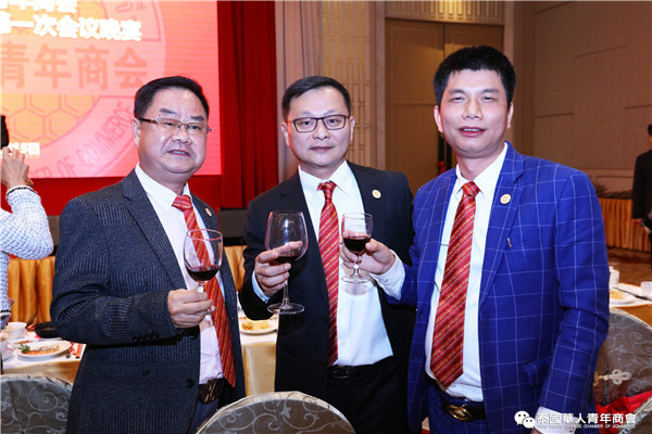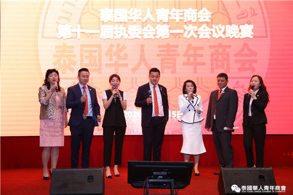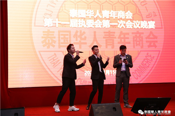 最后举行欢庆晚宴,大家把盏言欢,欢谈畅饮,充满着团结友爱,主持人赵子杰、钟慕岳、李振东首先高歌一曲《爱要坦荡荡&อยากร้องดังดัง》开场,现场气氛迅速高涨。随后,他们介绍了来泰工作、学习的经历,以及加入青年商会的初心。常执委们纷纷登台引吭高歌,李嘉淳、陈仕扬、陈平、陈晨、虎炎、佳丽、李鹏生、陈汉国演唱的《不忘初心》、陈平、陈晨、陈汉国、马嫣等演唱的《我和我的祖国》、李嘉淳、虎炎演唱《你最珍贵》、赵子杰、钟慕岳、马兴海、钟佳成、李俊杰表演舞台剧《在远方》,讲述了泰国华人青年商会走过多年,累积了许多辉煌,而正如刚才的歌曲所唱的,不忘初心。商会的创始前辈们当时怀着怎样的初心来到泰国,又是如何成立青年商会等。随后李鹏、虎炎等等纷纷登台为大家演唱歌曲,在一片欢呼声中,祝福泰中两国繁荣昌盛、国泰民安;祝福泰国华人青年商会明天会更好。