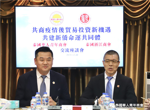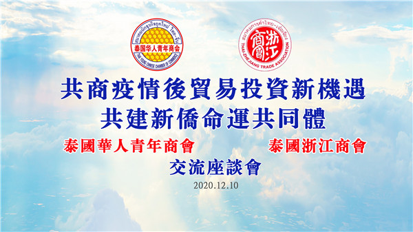 2020年12月10日下午,泰国浙江商会会长祁晓云一行到访泰国华人青年商会,受到了李嘉淳会长等的热情欢迎与接待,并举办“共商疫情后贸易投资新机遇,共建新侨命运共同体”交流座谈会。会上,播放了《泰国华人青年商会会务活动短片》,大家一同回顾了泰国华人青年商会成立二十年来各个时期的精彩瞬间;共同探讨了如何抓住疫情后时期贸易投资的机遇,在文化交流、经贸投资、共同促进新华侨在泰的和谐发展等方面携手并进。