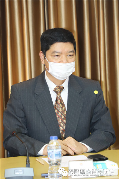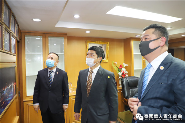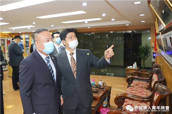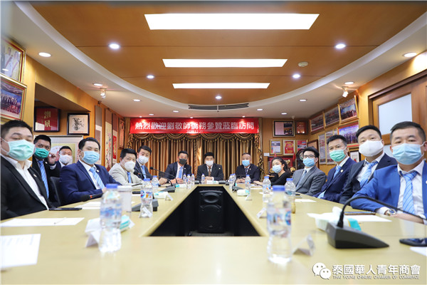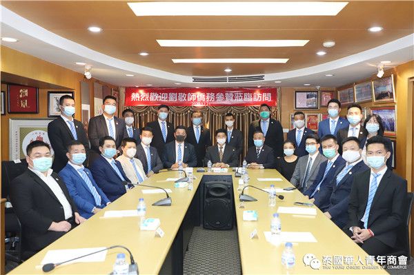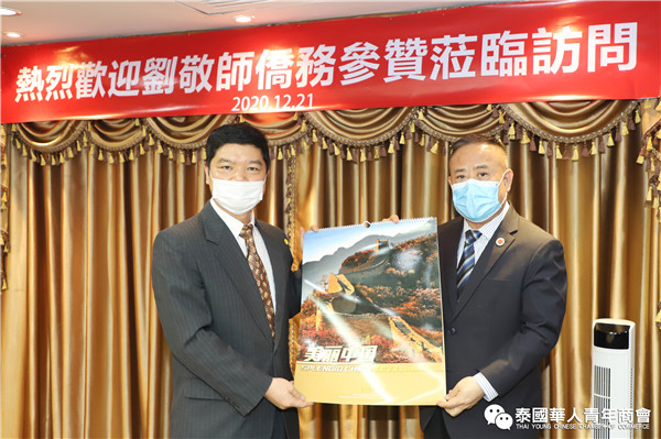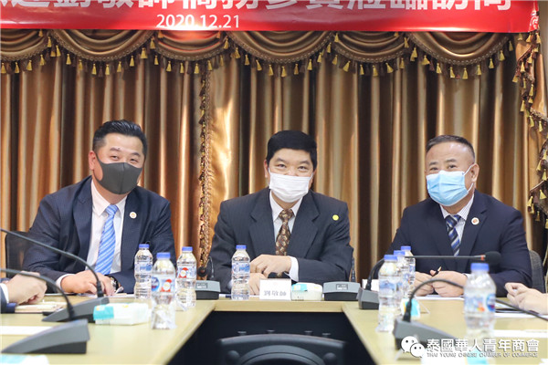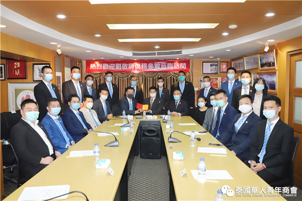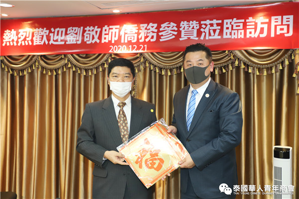 2020年12月21日下午,中华人民共和国驻泰王国大使馆侨务参赞刘敬师阁下、大使馆赵文婷秘书莅访泰国华人青年商会,受到永远名誉会长李桂雄、会长李嘉淳,常务副会长史大佗,副会长郑树丰、李大成、林晓东、杨灿宜、黄立雄、刘少毅,会长助理刘汉政、李泽明,副秘书长陈柱、钟佳成,主任委员朱冬雷、蔡奕园、李裕泉,常务委员赵子杰、王新宇、林标、张昊、林政希、马兴海等的热情欢迎与接待。