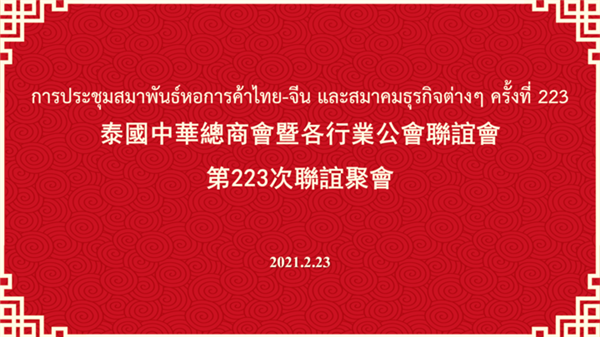 2021年2月23日上午,泰国中华总商会暨各行业公会联谊会第223次聚餐联谊会,于泰国中华总商会大厦光华堂成功召开。此次作东单位有:泰国中华总商会、泰米业公会、泰国影相商业总会、泰国皮业公会、泰国香港总商会、泰国江浙沪总商会、泰国江西总会(总商会)。