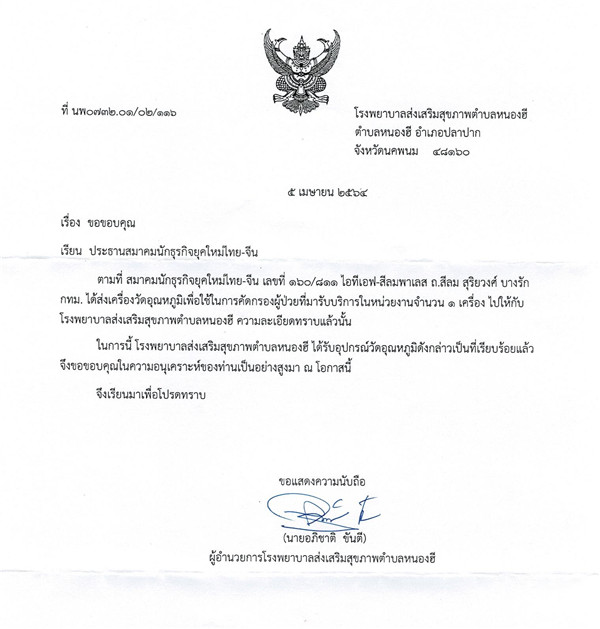 随后,李嘉淳会长马上组织召开会议,安排商会办公厅尽快联系有关单位,在额温枪送达的第一时间,捐赠到泰国清迈、清莱及偏远地区的400多家医疗机构、诊所、防疫点和学校等。