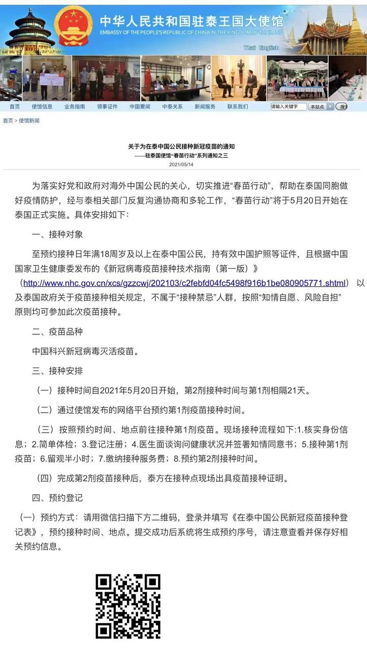 习近平主席提倡的“春苗行动”,近日来,通过中国大使馆多位领导积极推动,泰国中华总商会的共同努力,经与泰国相关部门沟通协商,于5月14日通过中国驻泰王国大使馆发布的网站平台预约第一剂疫苗接种时间。接种时间自2021年5月20日至6月4日,预约平台开通首日不到一个小时,前十天的预约号就被预约一空,有侨胞、企业员工、留学生、汉语志愿者教师等,惠及1600多位来自内地和港澳台的同胞。大家的踊跃报名,体现了在泰华侨华人对期待已久的中国疫苗的渴望和需要,大家相信即使相隔万里,海外同胞总有祖国坚强的后盾。