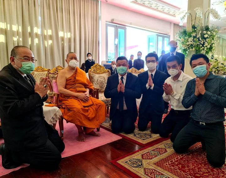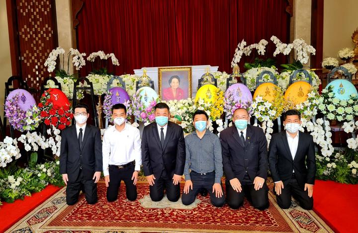 6月2日下午,泰国华人青年商会会长李嘉淳,常务副会长姚鸿春,副会长李大成,刘吉辉,廖晓文,陈卓平,会长助理陈世岳等前往参加致祭,谨具赙仪,敬呈拜輓,籍表哀思,往生极乐!并与孝眷颂德通猜大尊长合影!