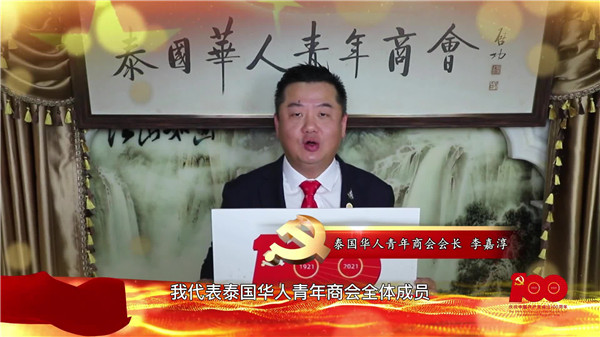泰国华人青年商会李嘉淳会长携商会全部会员,祝贺中国共产党100周年生日快乐!我们愿和全世界的华侨华人一起,为祖国的繁荣富强贡献力量!为百年伟业,民族复兴颂唱赞歌!
