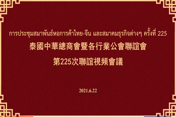 2021年6月22日,泰国中华总商会暨各行业公会以在线线下双模式召开第225次联谊会。此次会议作东单位有:泰国中华总商会、泰国文具办公仪器公会、泰国火锯公会、泰国石狮商会、泰国温州商会、泰国辽宁总商会、泰国深圳总商会。大会主席、泰国中华总商会主席林楚钦,大会副主席兼执行主任、泰国中华总商会副主席李桂雄,执行副主任、泰国中华总商会副主席蒋应初,特邀嘉宾、朱拉隆功大学经济学院副教授察优隆·讪拍诗博士等逾百人出席会议。