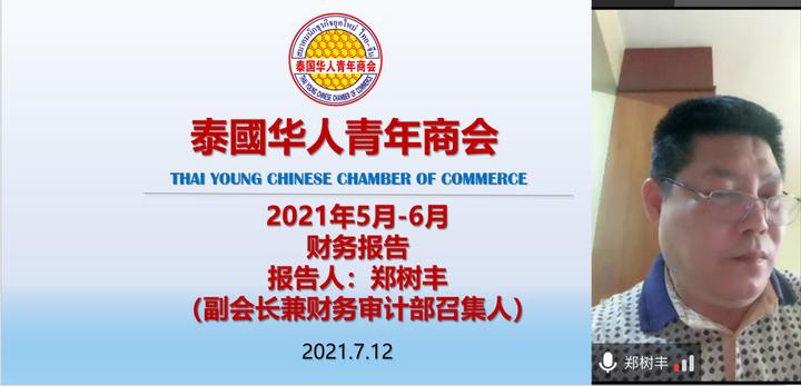泰国华人青年商会第十一届第五次执委会议,于2021年7月12日下午以视频会议形式成功召开。会长李嘉淳、常务副会长林玮、陈玉宝、姚鸿春、陈汉国、史大佗等60多位常执委参加了会议。会上通过了近期会务报告以及五、六月份的财务报告。会议由常务委员赵子杰主持。