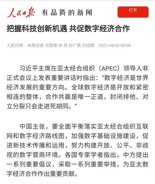 中国主张,要全面平衡落实亚太经合组织互联网和数字经济路线图,加强数字基础设施建设,促进新技术传播和运用,努力构建开放、公平、非歧视的数字营商环境。各国专家学者指出,中方提出一系列重要倡议,采取一系列重要举措,为亚太数字经济合作作出重要贡献。