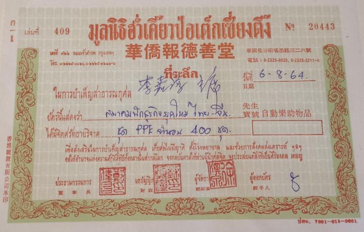 2021年8月6日,李嘉淳会长代表泰国华人青年商会专程前往华侨报德善堂捐赠400套医用防护服(PPE),由董事长郑伟昌先生、副董事长高梧桐先生、董事苏真达女士、董事徐光辉先生等亲自接领,再发放到志愿者手中,以便更好安全完成任务。