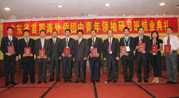 11月3日至9日,广东省首届海外社团中青年领袖研习於广州市开班,来自全世界二十二个国家三十九位学员参此次研习班,本会常务副会长邝锦荣代表泰国中青年参加首届领袖研习班。广东省侨办主任吴锐成,副主任陈豪丶林琳等领导主持开班仪式。中山大学,暨南大学均派出着名教授为研习班授课,研习班结业,由广东省副省长万庆良代表省委丶省政府领导出席结业典礼并做重要讲话,勉励学员回到各个国家,为侨界服务,为国家争光,并颁发结业证书。