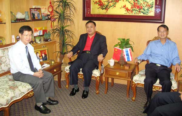 2月2日下午,泰国上议院议员、泰国上议院农业合作社委员会副主任、泰国上议院商业、工业委员会副主任乃差麟•汉瑟赛先生(左),在经济学家温治平博士(右)陪同下访问本会。李桂雄会长(中)会见了差邻上议员一行,并进行亲切交谈。