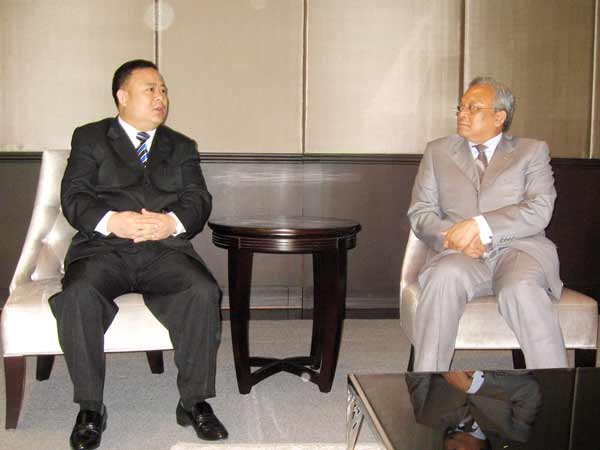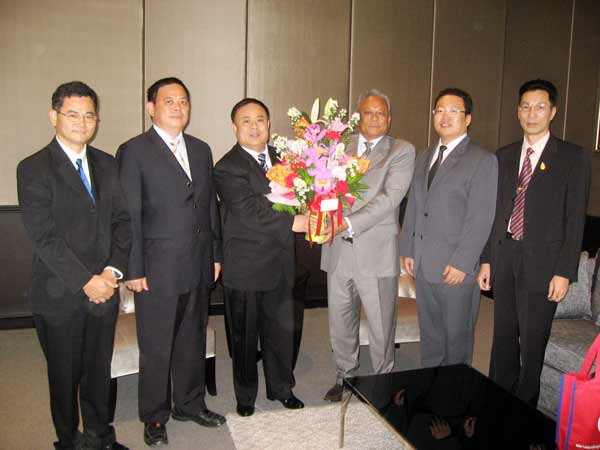 1月30日上午,泰国华人青年商会会长李桂雄率副会长邝锦荣、吴楚潮、宁禾、谢崇通、总干事黄成等往国务院总理府向国务院副总理素贴•特素挽阁下拜年祝福,祝贺素贴阁下上任国务院副总理,祝其新年快乐,辅政为民,为国家做贡献。 李会长一行受到素贴副总理的热情接见并进行友好的会谈。素贴副总理希望青商会能更好的促进泰中两国的友谊,为泰中两国的经贸合作继续充当重要桥梁,他特别指出:青商会企业家们如果需要政府的帮助与配合,本人将大力支持。 图上:青商同仁向素贴副总理(右三)献花拜年。 圖下:素贴副总理(右)与李桂雄会长(左)亲切座谈。