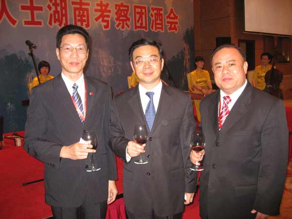 湖南省省长周強(中)与本会会长李桂雄(右)、常务副会长邝锦荣(左)在欢迎考察团酒会上合影。