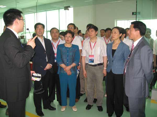 中共中央统战部副部长尤田兰(左三)、中共长沙市委书记陈润儿(左二)、中共湖南省委统战部部长李微微(右二)、本会会长李桂雄(后排左一)等一同考察威胜电子生产基地等。受到威胜集团董事局主席吉为(右一)的热烈欢迎。