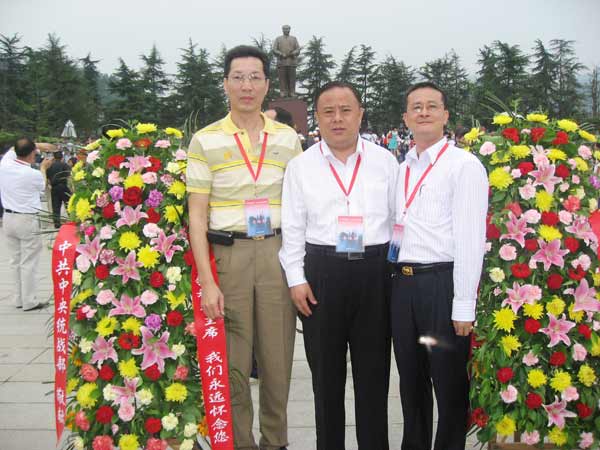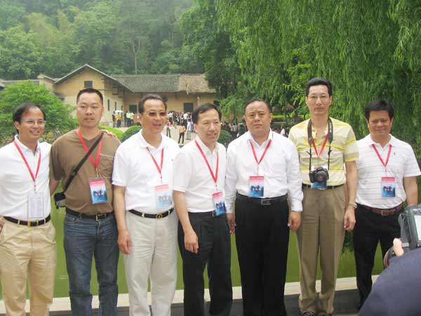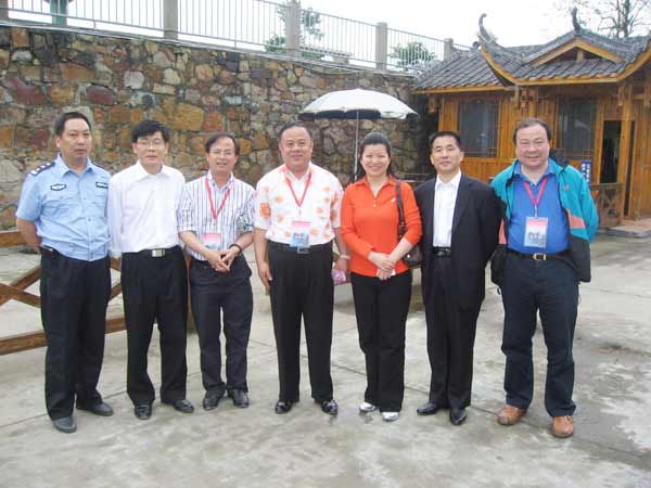 中共张家界市委统战部部长余怀民(右三)、李桂雄会长(中)、中央统战部联络处处长冯纪林(左三)、武陵源区委书记陈红日(右二)等在天子山贺龙公园留影。
