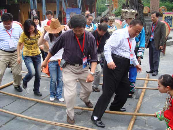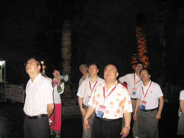 中共中央统战部三局许光任副局长(右二)、中共湖南省委统战部蔡建和副部长(左一)、陪同泰国李桂雄、美国梁冠军、西班牙徐松华、巴西杨建中等参观张家界黄龙洞景区。