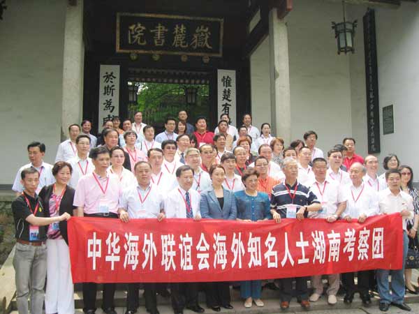 中共中央统战部副部长尤田兰(前排右五)、中共湖南省统战部长李微微(中)、梁冠军(左五)、徐松华(右四)、李桂雄(左四)等考察团全体团员在岳麓书院前合影。