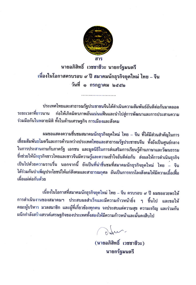 泰国华人青年商会在促进泰中两国友谊和经贸往来,发挥了重要作用并做出了贡献。成为政府与民间及社会团体之间的文化教育、语言技术、科技信息交流等的桥梁,沟通泰中两国人民良好的了解与合作。泰国华人青年商会还大力推动和参与社会公益慈善事业活动,列为大众楷模,并为构建团结、和谐、稳定的社会做出了系列贡献,本人表示赞扬。 值此泰国华人青年商会九周年之际,本人谨以至诚恭祝泰国华人青年商会会务蒸蒸日上,蓬勃发展;贵会负责人及全体仝人身心康泰,万事如意;共同为促进两国经济稳健发展而携手努力,向前迈进。