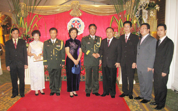 中华人民共和国驻泰王国大使馆武官安作山少将暨夫人于7月30日晚假曼谷律实他尼大酒店举行"中国人民解放军建军八十二周年庆祝酒会",出席酒会的有泰国军警长官及驻泰使节武官、各侨团首长,场面隆重。本会出席的有李桂雄、邝锦荣、宁禾、蔡荣庄、许俊龙、武风、吴令平、王少青、陈子震等。