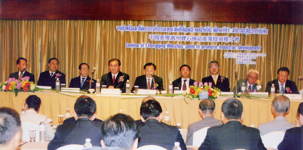 万州区委书记吴政隆致词:代表重庆万州区政府及万州一百七十三万人民,向各位嘉宾的莅临表示热烈欢迎和衷心感谢!他说:自从八月二十日晚上踏上泰国这美丽的土地,就受到了泰国华人、华侨及各界人士的热情接待和周到安排。让我们深深感受到中泰两国之间友谊渊源流长,也感受到中泰两国之间进一步加强经贸合作关系的强烈愿望!他指出:我们这次泰国之旅,既是一次友谊之旅,更是一次合作之旅,主要是参观、学习泰国在宝石加工、贸易方面的先进经验,寻求双方互利合作关系,力争将万州打造成中国人工宝石加工的重要基地。他强调:中国政治稳定,人口众多、市场庞大,人力资源十分丰富,而且经济一直持续快速发展,商机无限,进入中国就意味着抓住商机,抢到了世界最大市场,尤其像宝石产业,未来最大市场一定在中国。他列举到万州投资的各种优势:包括特殊的区位优势,良好的人力资源,交通运输优势,享有西部大开发,三峡库区直辖市等各种优惠。是中国政策优惠迭加区,优越发展环境实属少有伦比。