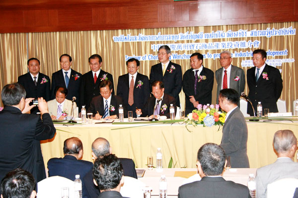 泰万双方举行近十宗签约仪式,恭请主席台领导见证,是推介会成功的明证。出席推介会的泰国九属会馆首长与吴政隆书记、丁坤林副区长互赠纪念品。万州政府设晚宴款待出席的逾百位领导、嘉宾,举杯互祝泰中经贸合作取得辉煌成果,投资万州的企业家们都能实现理想,祝友谊万古长青!
