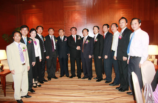 泰国工业部长苍猜‧猜仑能(中),泰国国务院事务部部长助理亿甲塞‧宁绿博士(左五),重庆市市委常委、万州区区委书记吴政隆(右六)、万州区副区长丁坤林(左四)与泰国华人青年商会同仁在推介会上合影。