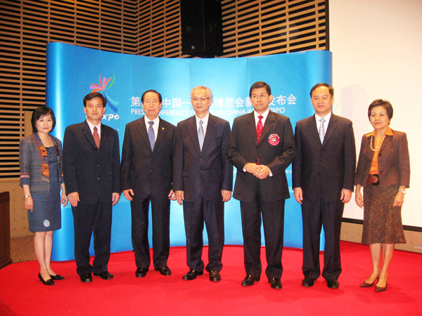 2009年8月27日上午,"第六届中国——东盟博览会"新闻发布会假泰国商务部举行,此次新闻发布会由中国——东盟博览会秘书处与泰国出口促进厅(DEP)联合举办。中国大使馆吕健公使,泰国商业部出口厅厅长拉谦(中)、泰中友好协会会长功·塔拍兰氏(右三)、泰国中华总商会主席吴宏丰博士(左三)、中国——东盟博览会副秘书长农融(右二)、本会会长助理鍾和武(代表李桂雄会长)(左二)、泰国商会、泰国工业院等代表出席了此次发布会。第六届中国——东盟博览会将于2009年10月20至24日在中国南宁举办。