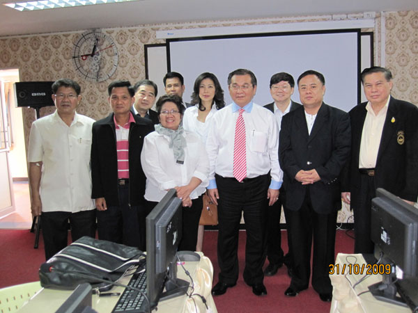 图与文:李桂雄会长(右二)一行拜访了曼谷军吞武里大学的政治系领导级博士学习班,得到学习班成员工业部部长仓猜•猜伦良(右三)、科技信息部部长拉浓叻•素旺差威(左三)、教育部副部长娜妮莎•差旺丹披帕(后排左三)、卫生部前部长德差•素卡隆医师(右一)等诸位领导的热烈欢迎。
