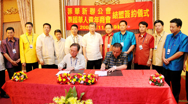 签约的时间适逢"第十届世界华商大会"在菲京马尼拉举行,李桂雄会长率领泰国华人青年商会代表团前往菲京出席,按照李桂雄会长与林金山理事长于今年10月20日在出席广西南宁举行的"中国东盟博览会"时,双方因志同道合而达成的合作缔盟意向,经一个月的筹备,结出硕果,双方出席签约仪式的有:泰国华人青年商会名誉会长陈国鑫、卢松盛,顾问赵春森、李雄,社长吴金城,副会长林嘉南、邝锦荣、吴楚潮、蔡荣庄、谢崇通,会长助理锺和武,主任欧阳建生、张楚南、林慰民等,菲华新联公会参加者有:永远荣誉理事长蔡友铁,名誉理事长吴荣德,执行副理事长王书侯,副理事长颜永洲、蔡继汗、李法铭、蔡志河、蔡永柠,副监事长陈世局、林乘福,副秘书长黄天贶,财政副主任黄攀桂,总务主任蔡鸿语,保管主任黄国杰,义诊主任黄紫云,企划副主任蔡友声,总务副主任施安妮,企划副主任方超瑜,展览副主任颜清祜,中文书副主任杨子贤,西文书副主任丁书斌,新闻副主任王宏忠,组织副主任蔡福金,妇女副主任施白莹,康乐副主任陈毓珍,联络副主任陈丽玲,文艺副主任陈锦平,外交副主任许子育,舞蹈副主任何佩兰等四十余人。