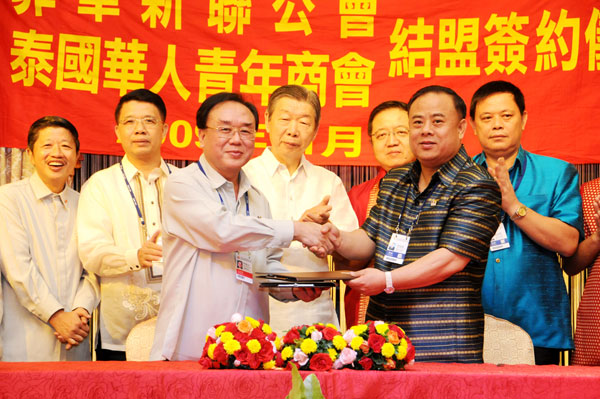 本会的发展空间越来越广,冲劲愈来愈强,缔交日益增多。芳菲的金菊盛开时节,本会与美丽岛国菲律宾同样具生机活力的代表性商会——菲律宾新联公会,经充分酝酿成熟而缔结友好合作关系,于11月19日晚,在菲京马尼拉市举行两会结盟签约仪式,由泰国华人青年商会李桂雄会长和菲华新联公会林金山理事长联合签署了《友好合作协议书》,永结金兰,信守承诺,商机共享,与祖籍国华夏神州构成黄金三角经济合作区,为三国的经济繁荣和商贸合作贡献最大力量,此则喜讯已成为泰菲华社传颂的佳话。