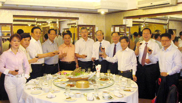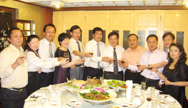 阳光洒金,财星照临。"中国财富百人协会"和"青年才俊联盟"合组访泰代表团,由该协会会长张伟超阁下为荣誉团长,该协会主席梁明明董事长任团长,率领一行十八人,在中国驻泰大使馆左志强参赞陪同下,于2009年12月2日中午12时,丽日中天的晌午,莅临本会访问,受到李桂雄会长、会长助理胡坚毅、锺和武、主任许俊龙等热烈欢迎。宾主亲切座谈了一个小时,至下午一时,东道假香格里拉大酒楼设宴款待,席中继续叙谈,为今后经贸合作,共享、共商、共赢,并建立起长期结盟协作关系而磋商。