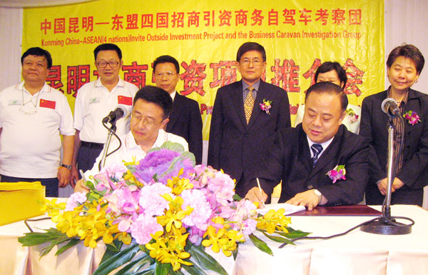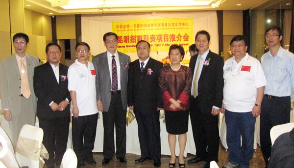 2009年12月29日,由中国侨联委员、昆明市侨联主席周凡率领的"中国昆明——东盟四国招商引资商务自驾车考察团",一行五十多位组成的庞大车队,抵达泰国曼谷进行考察访问,并举行"昆明招商引资项目推介会",与本会达成并签署了多项合作意向协议书(由李桂雄会长代表商会签字)。出席推介会和签署仪式的有泰国初阁陆军上将、泰国旅游总局东亚市场管理部主任恩蓬·集拉甘威赛女士、中国驻泰一等秘书胡广祥、泰国驻昆明商务领事素威蒙女士、商务部顾问庵帕女士、泰国旅游协会主席黄汉忠、泰中经济贸易中心总裁蔡义批、泰国云南会馆理事长欧阳嘉运、泰国云南商会会长杨源辉、商务副会长杨芳舒、泰国广肇商会会长邝锦荣等。本会參加者有谢崇通、胡坚毅、叶沐强、吴南江、潘丞仲、陈子震、周锦萍、岳群、黄成等。