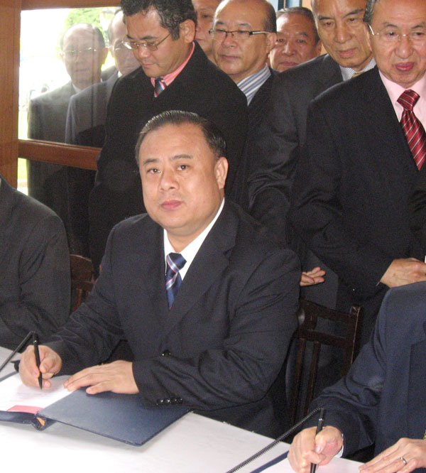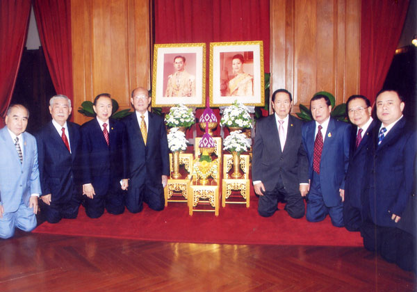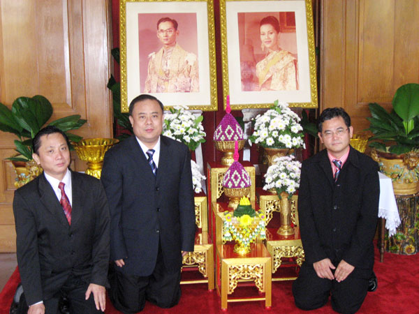 2010年元旦清晨,会长李桂雄、副会长谢崇通、主任许俊龙、总干事黄成等,代表泰国华人青年商会全体仝人晋宫签名,恭向皇上陛下、皇后殿下拜年,恭祝皇上陛下万寿无疆、皇后殿下懿寿千秋,国运昌盛,国泰民安。图上:李会长签名致贺;图下:在大皇宫皇上皇后御像前,李桂雄、谢崇通、许俊龙合影。