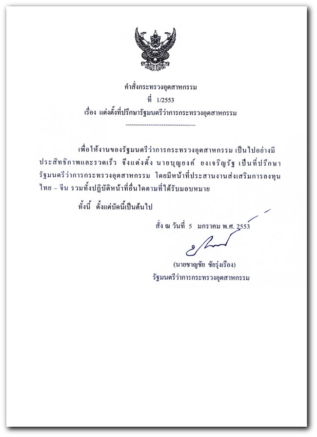 ฯพณฯ นายชาญชัย ชัยรุ่งเรือง รัฐมนตรีว่าการกระทรวงอุตสาหกรรม ชักชวนนักธุรกิจจีนและประเทศอาเซี่ยน ขยายการลงทุนมายังประเทศไทย เพื่อกระชับการค้าระหว่างประเทศ โดยแต่งตั้งนายบุญยงค์ ยงจริญรัฐ เป็นที่ปรึกษารัฐมนตรีว่าการกระทรวงอุตสาหกรรม เพื่อผลักดันการค้า และช่วยประสานงานการส่งเสริมการลงทุนระหว่างไทย-จีน โดยได้มีการมอบใบแต่งตั้งที่ปรึกษาให้กับนายบุญยงค์ ยงเจริญรัฐ ณ กระทรวงอุตสาหกรรม ในวันที่ 5 มกราคม พ.ศ.2553