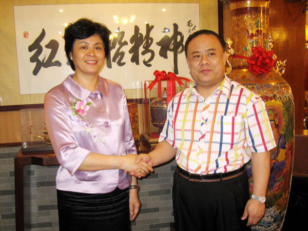 湖南省副省长甘霖阁下率政府代表团访问考察泰国,于2010年1月8日晚,在红头船大酒楼受到本会会长李桂雄的热烈欢迎,甘副省长与李会长进行了亲切交谈和交换意见。图为甘霖副省长(左)与李桂雄会长握手叙谈时影。