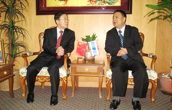 从中国北京寒冷天气中来到暖如三春的泰京访问的中国人民对外友好协会(简称中国对外友协)代表团,在副会长冯佐库先生的率领下,于2010年元月19日上午,来到该团抵泰后访问的首站—泰国华人青年商会,受到与冯佐库副会长已有多年交谊的青商会李桂雄会长等青商领导的热烈迎接,在青商会参访座谈了一个多小时。中午艳阳如夏,东道主热情也更灼,假中国皇宫大酒楼设盛宴款待,令贵宾们有如归家般亲切温馨。