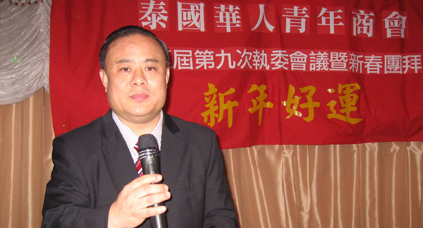 他还谈到祖国的大好形势和发展商机,号召大家为推动泰中友好、经贸合作、文化交流而继续努力,积极参与祖国家乡的经济建设,为祖国和平统一事业做出应有的贡献。也谈到了在国内访问期间与有关领导会晤的情形,特别是与中国侨联领导商谈"中国侨联2010年海外青年委员年会"将于泰国举办,如果诸位执委一致同意,将与庆祝泰国华人青年商会成立十周年同时联合举行。今年七月一日,且是泰中建交卅五周年,月前来访我会的中国对外友协冯佐库副会长也表示将与我会联合举办有关庆祝活动的意愿,遂请大家商量,提出宝贵的意见。李会长的致词在热烈的掌声中结束。