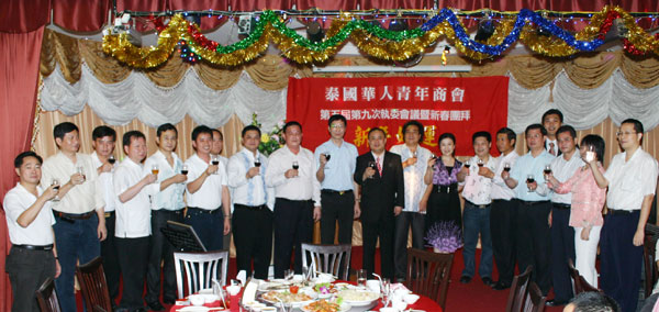 虎啸龙吟祝好运,青商执委同迎春。泰国华人青年商会提早一周喜迎新春,于二月七日(农历己丑年十二月廿四日)美好良宵,隆重召开具双重功能的第五届第九次执委会议暨新春团拜联欢晚会。李桂雄会长刚自神州出席完广东政协第十届第三次会议,便于是晚亲临主持会议,出席的常执委逾百人,精英盈座,一堂济济。