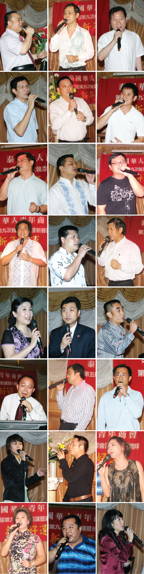 接下的庆春联欢和开始时的属龙属虎者之吟啸歌唱,精彩纷呈,在一流司仪方舫会长助理随即应付的主持下,每位善唱的执委都登台献唱,邝锦荣唱《上海滩》,吴南江、林慰民合唱《山丹丹花开红艳艳》、陈汉国唱《望乡》、吴令平唱《送你一碗青稞酒》、孙丽玲唱《好人一生平安》、林兆祥唱《我只在乎你》、黄懿光唱《愚公移山》、吴楚潮、方舫合唱《真的好想你》、《走进新时代》,《恰似你的温柔》、林启扬唱《一生痴心》、李桂徐、汤秀宝合唱《无言的结局》、李桂雄唱《耶利亚女郎》、权慧唱《故乡是北京》、郑树丰唱《高原红》、《做你的爱人》、蔡荣庄唱《不能没有你》、马嫣唱《四个心愿》、刘龙唱《天路》,林嘉南登台向大家拜年,林深、武风、刘振宁、林立新等纷纷登台高歌助兴,接着《明天会更好》、《难忘今宵》、《歌唱祖国》的大合唱和青商会成员青春活力的交际舞步一阵阵震撼湄南河畔。皆知青商们才华出众,能歌善舞,如凤似龙,却步人能想象他们个个好似歌舞明星,倘若时间允许,他们会唱到天明。