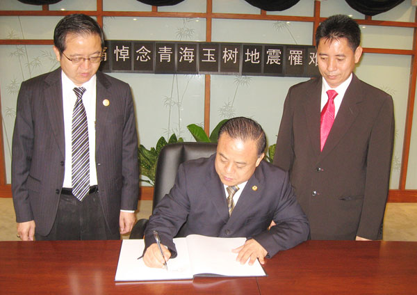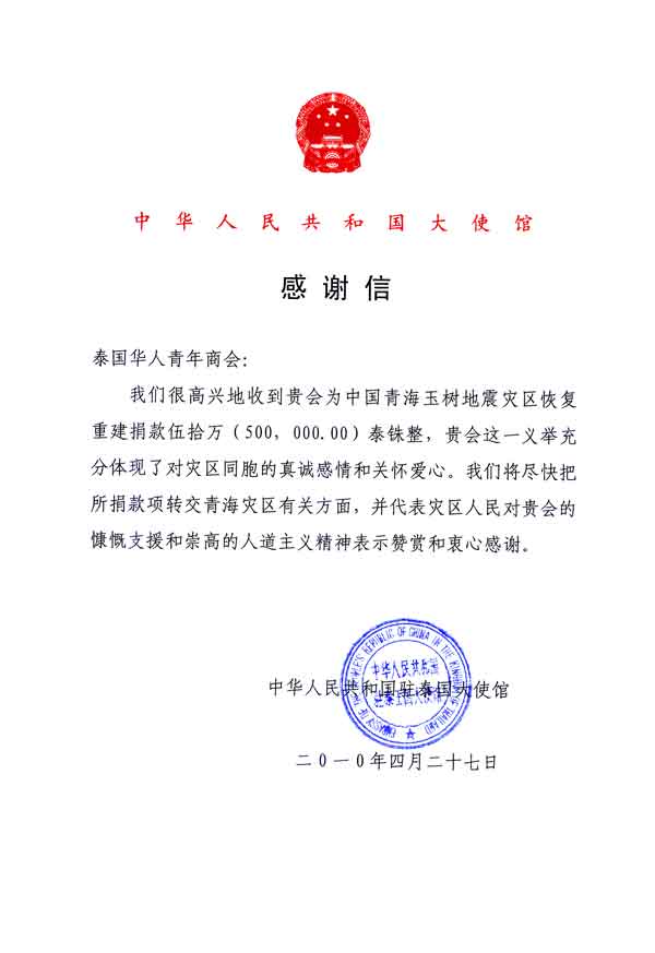 李桂雄会长和本会领导,怀着沉重之心情,于2010年4月27日上午,赴中国驻泰王国大使馆签名沉痛悼念青海玉树地震罹难者并拜谒中华人民共和国驻泰王国特命全权大使管木阁下,呈献这笔救灾款,人虽在泰,心随此款同飞灾区,愿为灾胞解当前急难,但愿广大同胞,齐心奉献,集腋成裘,支援灾区人民,家园重建,早脱苦难。