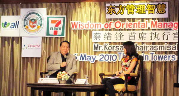 由正大集团辖下正大管理学院、7-11便利店联合举办的东方管理智慧讲座,于2010年5月6日下午二时假本京帝日大酒店四楼寳伦厅举行,7-11便利店总裁蔡绪锋先生主讲,出席人数近二百人,蔡绪锋总裁就关于企业管理,东方国家与西方国家不同方法作详细演讲。本会出席者的有副会长邝锦荣、会长助理叶沐强、主任许俊龙、常委陈俞龙、执委锺福安、方圆、孙丽玲等。