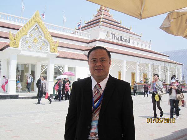 图五、图六:2010年5月1日的开园活动中,李桂雄在中国馆、泰国馆前留影。