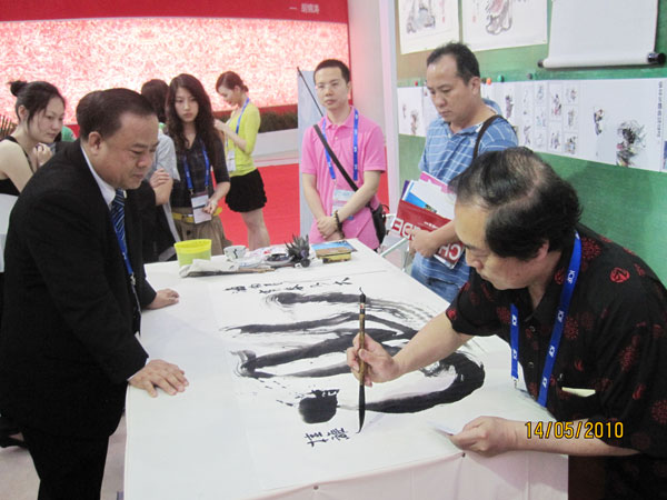 图三:中国著名书画家、国家一级舞台美术设计师张忠安在文博会上现场挥毫赠送墨宝予李桂雄。