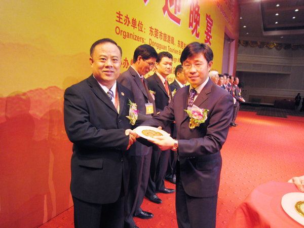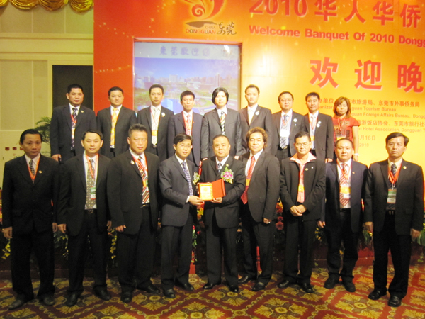 16日,李桂雄一行怀着海外赤字爱国爱乡的悠悠情怀飞赴东莞。当晚出席市人民政府欢迎晚宴。东莞市人民政府副市长成洪波,旅游局局长梁少蝦,外事侨务局副局长谢振华等领导国际会展大酒店国际宴会厅热情迎接各国代表团,并与李桂雄会长等情切交谈,合影留念。