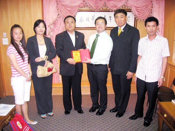 7月24日下午泰京曼谷大学中国办事处主任、人文学院中文专业主管、国际学院副院长谢华博士抵本会访问,受到会长李桂雄,会长助理许少玉,执委黄奕明、萧沛侨等热情接待,李会长与谢博士就有关中文教育在泰推广,中国留学生在泰在就读等问题做深刻探讨交流。图为李会长赠送纪念品予谢华博士。