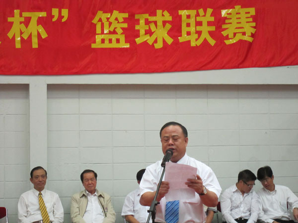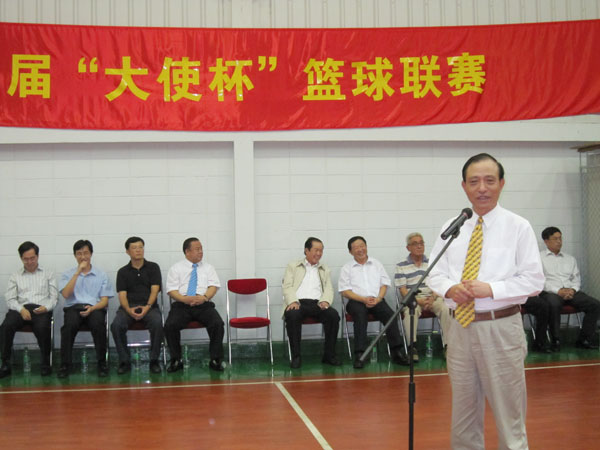 在泰中建交卅五周年庆祝活动的光辉岁月里,由中国大使馆首倡并主办,获得各团体积极参与和协办的第一届"大使杯"篮球联赛又在今天吉祥的气氛中拉开序幕,马上就要展开精彩的"开场战",我有机会代表协办单位之一的泰国华人青年商会,并率领青商会球队出席参加,和诸位聚首一堂,共襄盛举,深感荣幸和万分高兴,并衷心感谢中国大使馆管木大使和全体官员,提倡 "以球会友、和谐华社"之"大使杯"篮球联赛新创举!