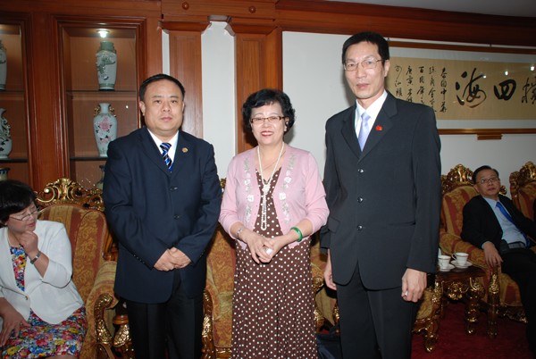 9月19日中华全国归国华侨联合会主席林军率领代表团莅泰访问,泰国中华总商会、潮州会馆联合泰华各界假中华总商会光华堂举行公宴大会,图为本会会长李桂雄(左)副会长邝锦荣(右)与广东省侨联主席王荣宝(中)在公宴大会上合影