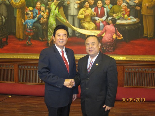 2010年9月30日,中国全国政协澳港台侨委员会主任陈云林阁下于全国政协大礼堂亲切的会见并宴请参加"庆祝中华人民共和国成立61周年"活动的侨胞代表。图为陈云林主任(左)会见泰国华人青年商会会长、中国全国政协第十一届三次会议列席代表李桂雄先生(右)时影。